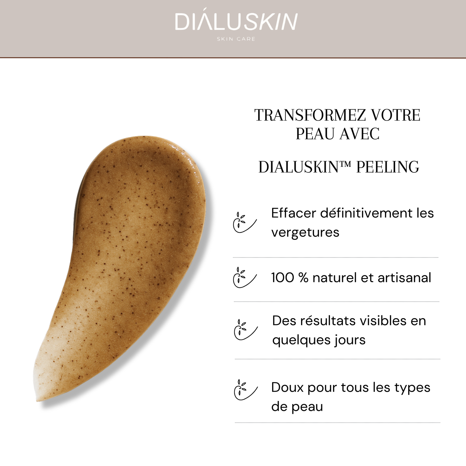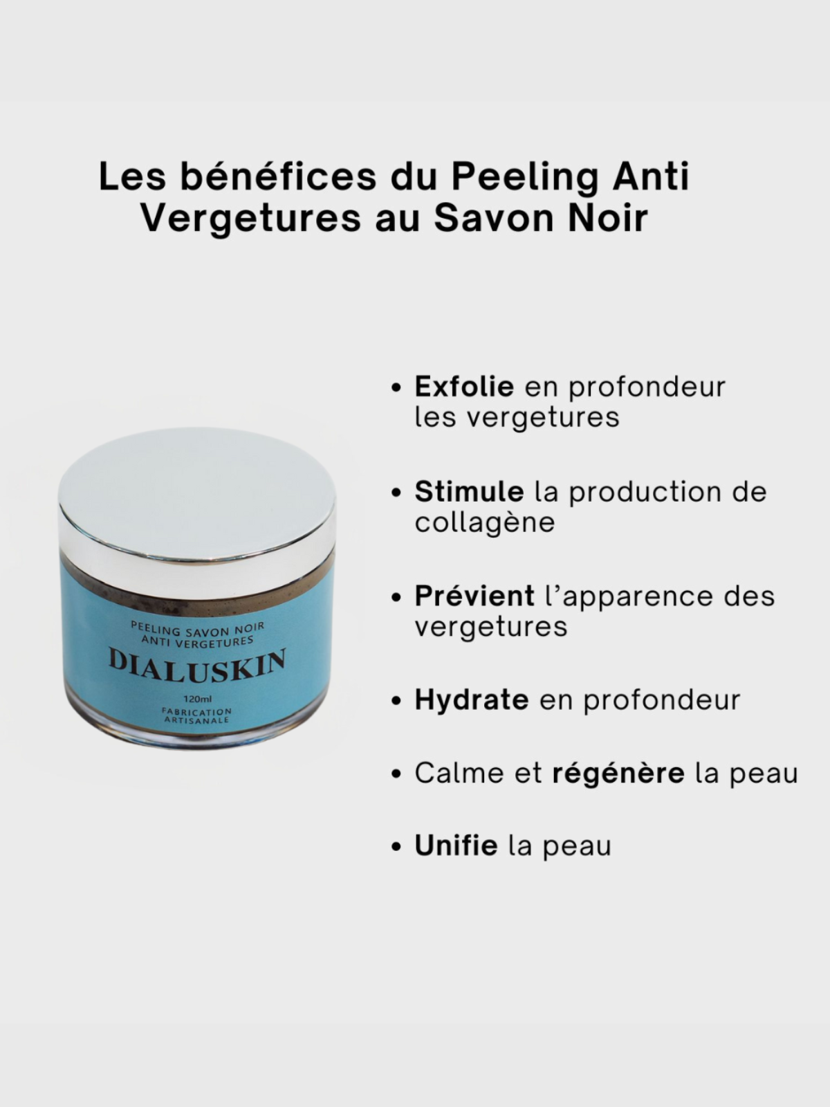 DIALUSKIN™ Black Soap Peeling est la seule formule artisanale française qui élimine définitivement les vergetures, et ne se contente pas de les estomper.